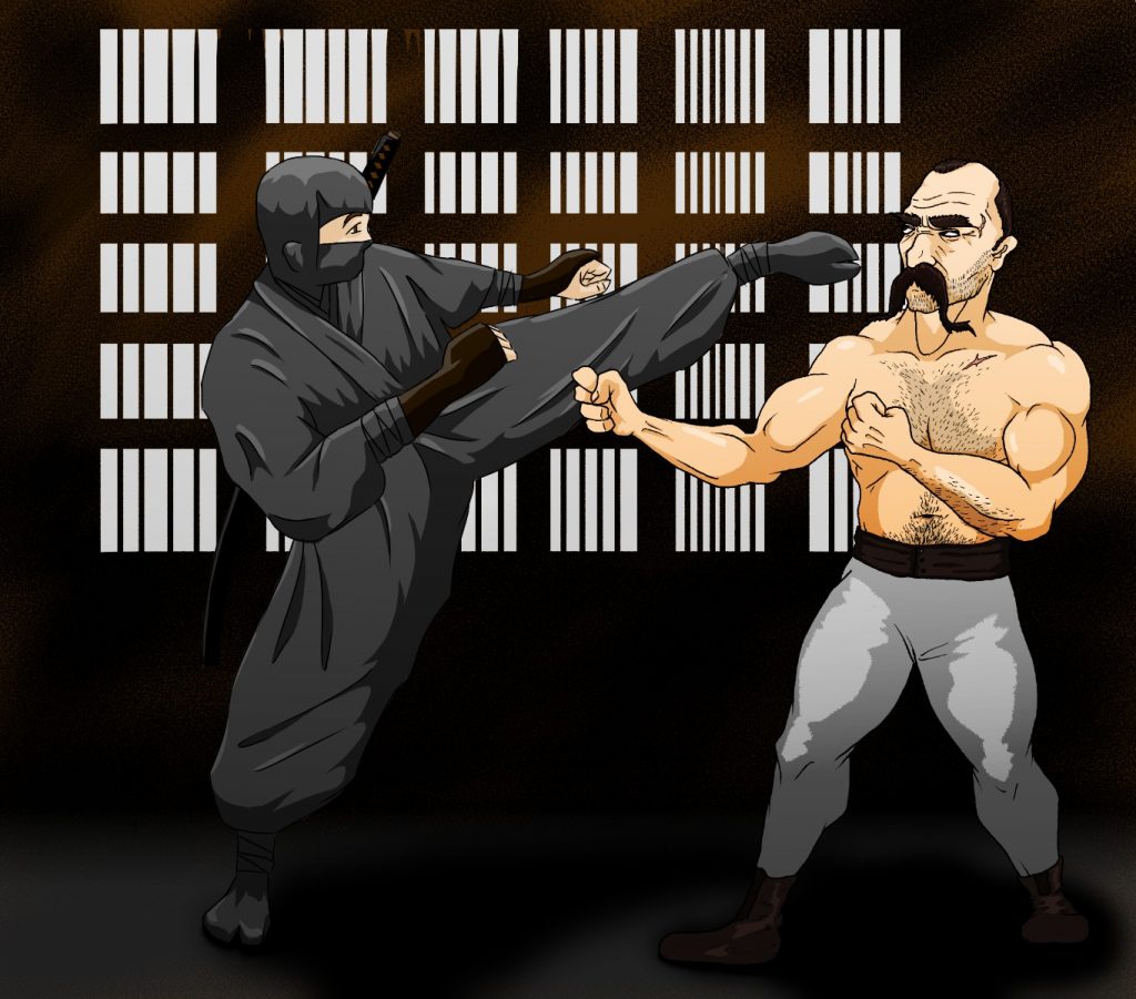 Et après quelques heures de travail, d’esquisses, de croquis et de nombreux coups de gomme, voici donc le combat d’un Ninja contre un boxeur anglais old school. Francesco a adopté le même style BD et on pourrait presque croire que le même dessinateur a réalisé la totalité du dessin. Un oeil averti repèrera notamment quelques différences anatomiques. Les proportions sont un peu différentes sur les deux personnages. La tête du boxeur est plus grosse que celle du ninja et ses membres sont plus épais et plus courts que ceux de l’autre personnage. Les traits et couleurs forment cependant un bel ensemble. Je suis très heureux d’avoir pu collaborer avec Francesco et j’aimerais avoir l’occasion de recommencer.