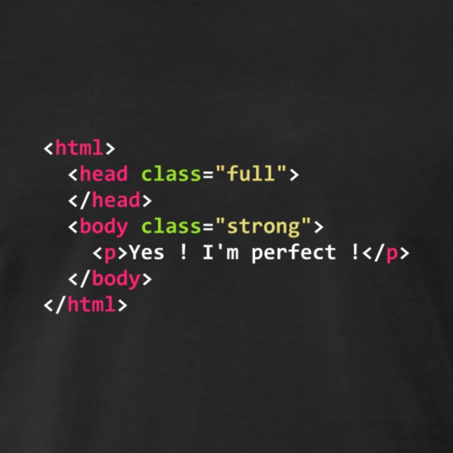 Mise à jour : Après plusieurs mois d’existence, je constate que la meilleure vente n’est pas un dessin, mais un design très simple que j’ai crée pour m’amuser. Il est destiné aux geeks et aux développeurs qui seuls peuvent le comprendre, parce que c’est un bout de code HTML (le langage qui sert à créer des pages web). Ça signifie « Une tête pleine, un corps fort : je suis parfait ! ». D’ailleurs, il ne s’est pas vendu que des t-shirts, mais aussi des sweats, des casquettes et des bodies pour bébé. Je pensais que les mugs auraient plus de succès. Ceci prouve à quel point il est difficile de prévoir ce qui se vendra ou non.