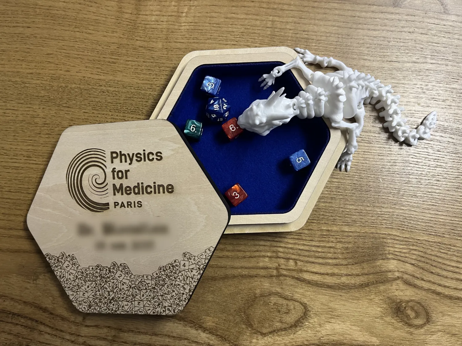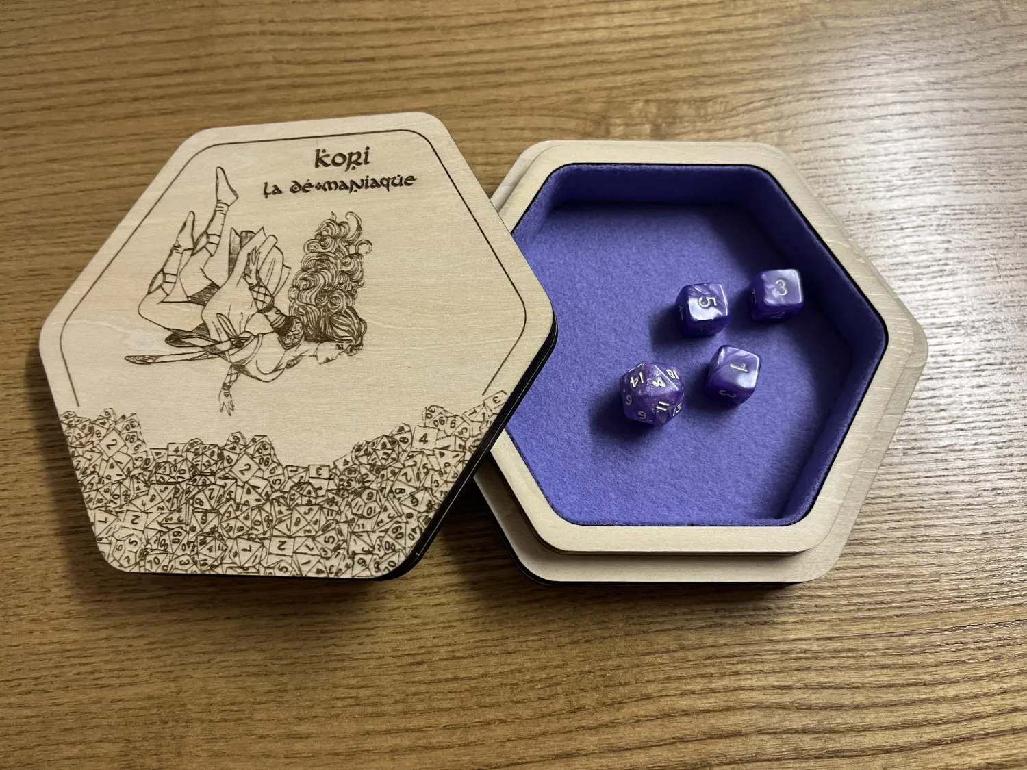 Cette boite à dés / piste de dés en bois personnalisable trouvera une place de choix à votre table de jeu. De forme hexagonale, elle permet de ranger environ 50 dés à jouer de taille standard de toutes les formes. En cours de jeu, elle peut être utilisée comme une élégante piste de lancement de dés grâce à sa grande taille et son intérieur entièrement recouvert de feutrine. Elle peut également être utilisée comme boite à bijoux. C’est un cadeau idéal pour un meneur de jeu de rôles comme pour un joueur. Elle est personnalisable selon trois critères :